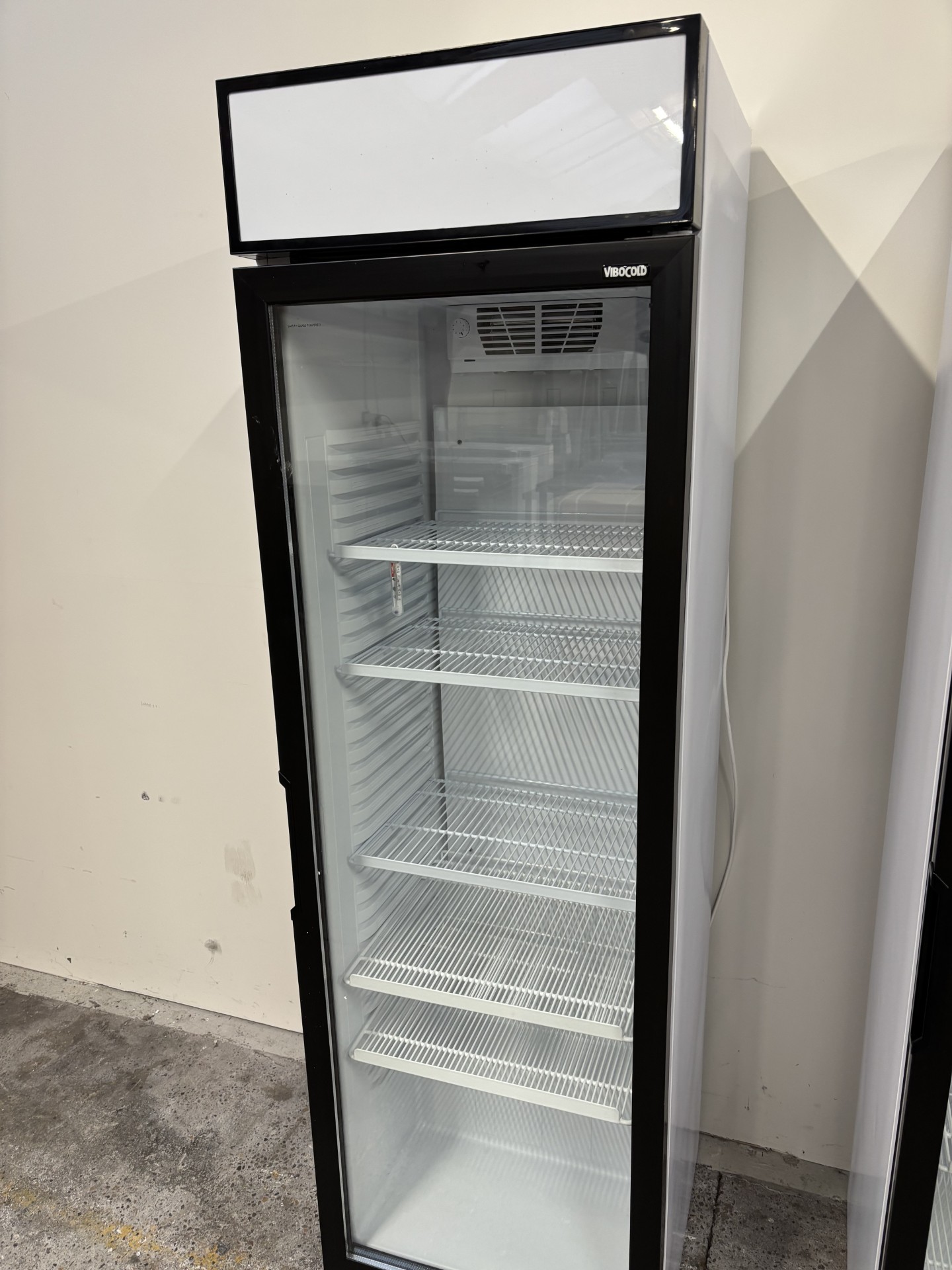Solidt og funktionelt displaykøleskab med glasdør, LED-lys, indbygget håndtag og 5 hylder.