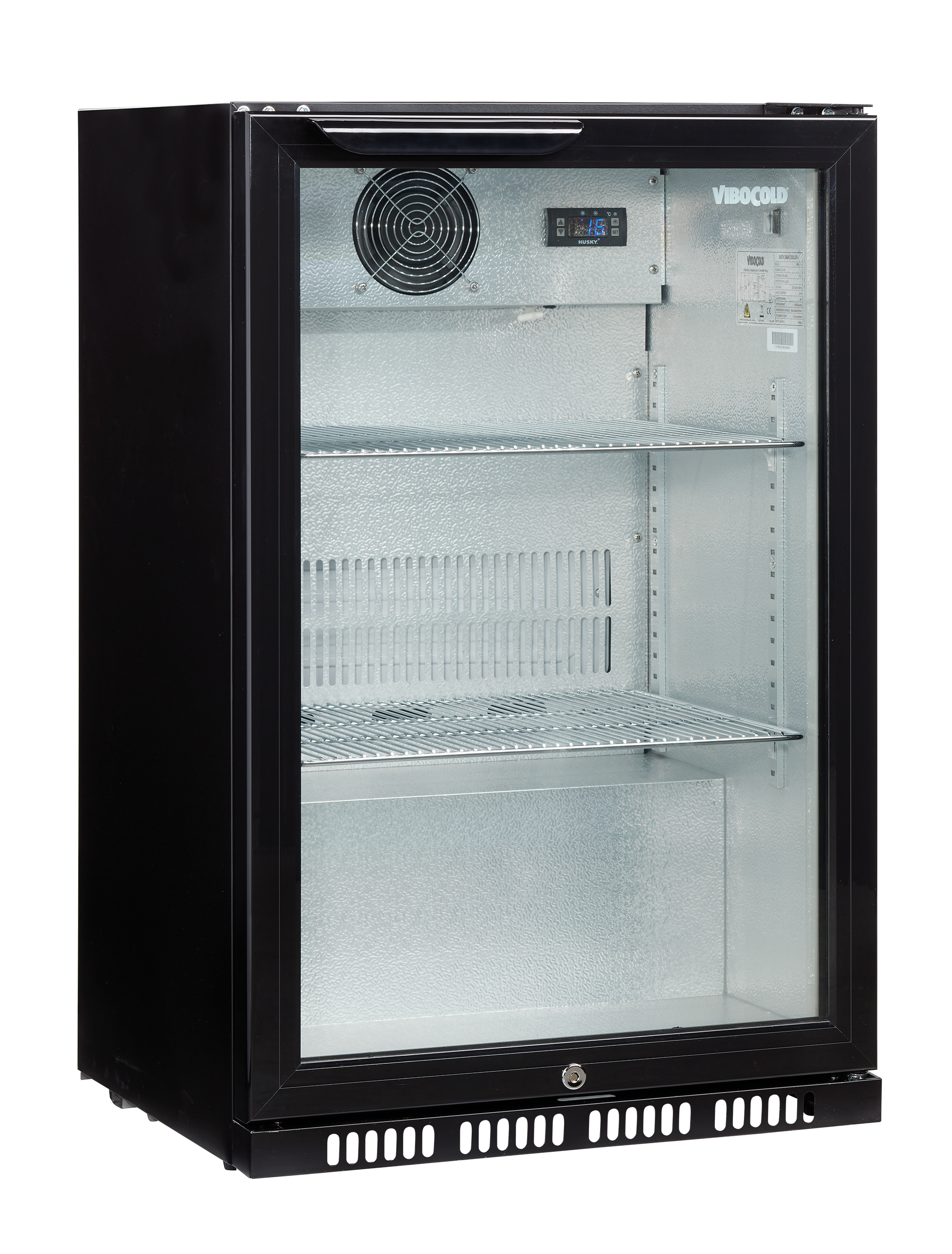Denne back bar leveres med to justerbare hylder og en højrehængt, selvlukkende glasdør med dobbeltglas. Køleskabet er energioptimeret og har ventileret køling, digitalt termometer og elektronisk styring.