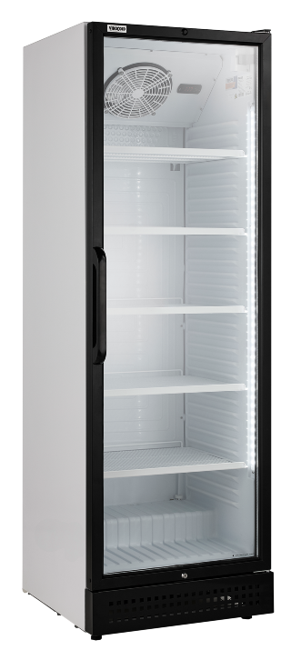 Klassisk displaykøleskab med vendbar, selvlukkende glasdør, LED-lys og fem justerbare hylder.